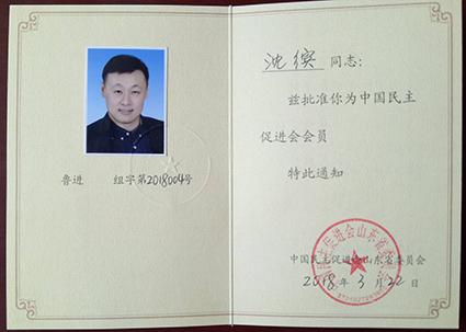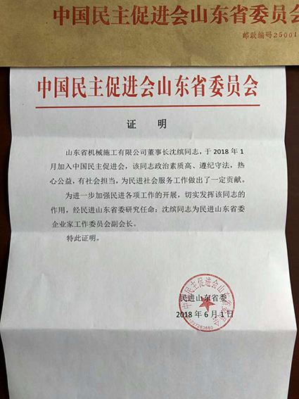 公司董事長沈繽同志于20181申請加入中國民主促進會3月份中國民主促進會山東省委員會正式批準沈繽同志加入中國民主促進會。