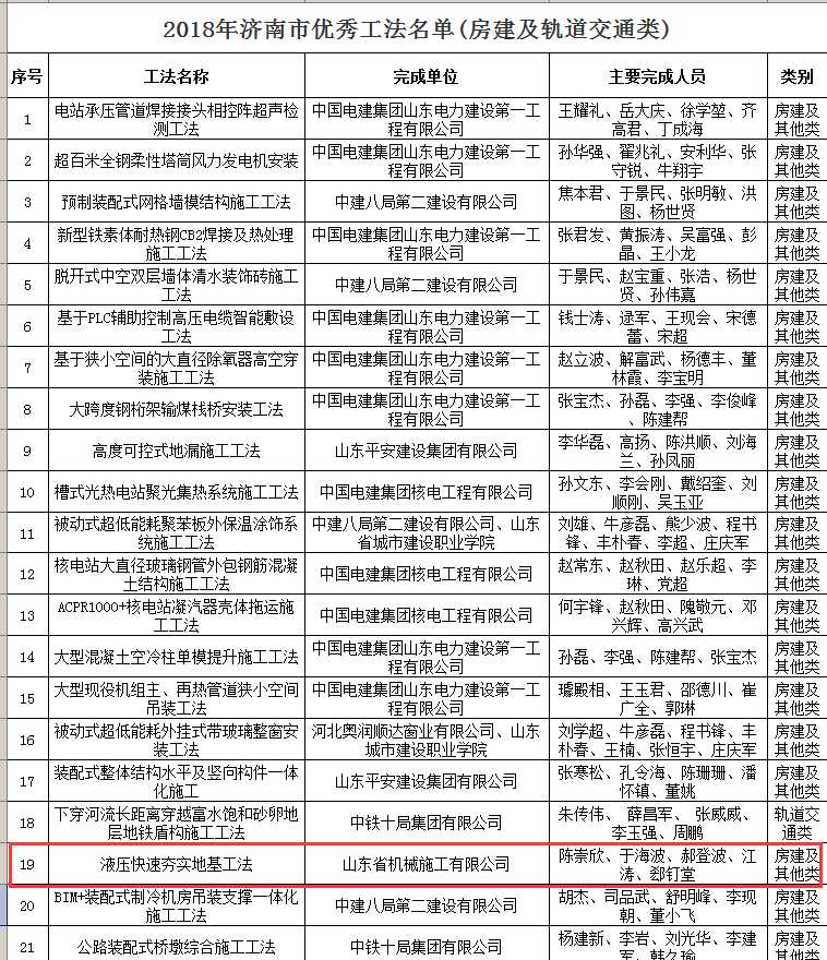 《2018年濟南市優(yōu)秀工法》名單出爐,山東機施與多家“中”字頭國企并駕齊驅(qū),更是基礎(chǔ)建設(shè)行業(yè)中唯一上榜企業(yè)。