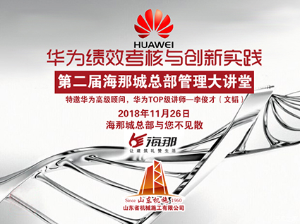 2018年11月26日,公司組織公司管理骨干在海那城總部,參加第二屆海那大講堂——華為績效考核與創(chuàng)新實(shí)踐現(xiàn)場講授活動(dòng),主講人:華為高級(jí)顧問、TOP講師李俊才先生。
