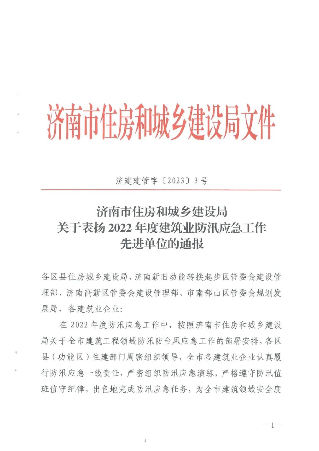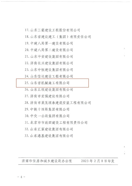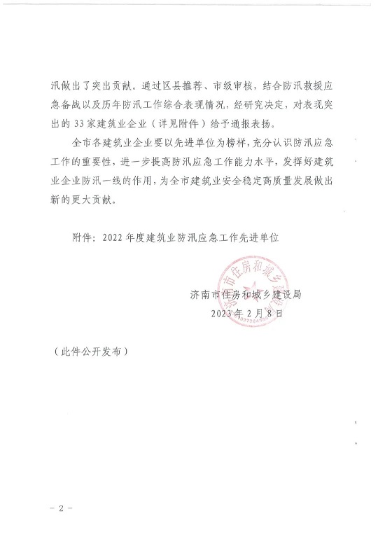 近日,濟(jì)南市住房和城鄉(xiāng)建設(shè)局發(fā)布的《關(guān)于表揚(yáng)2022年度建筑業(yè)防汛應(yīng)急工作先進(jìn)單位的通報(bào)》中,山東省機(jī)械施工有限公司榜上有名。